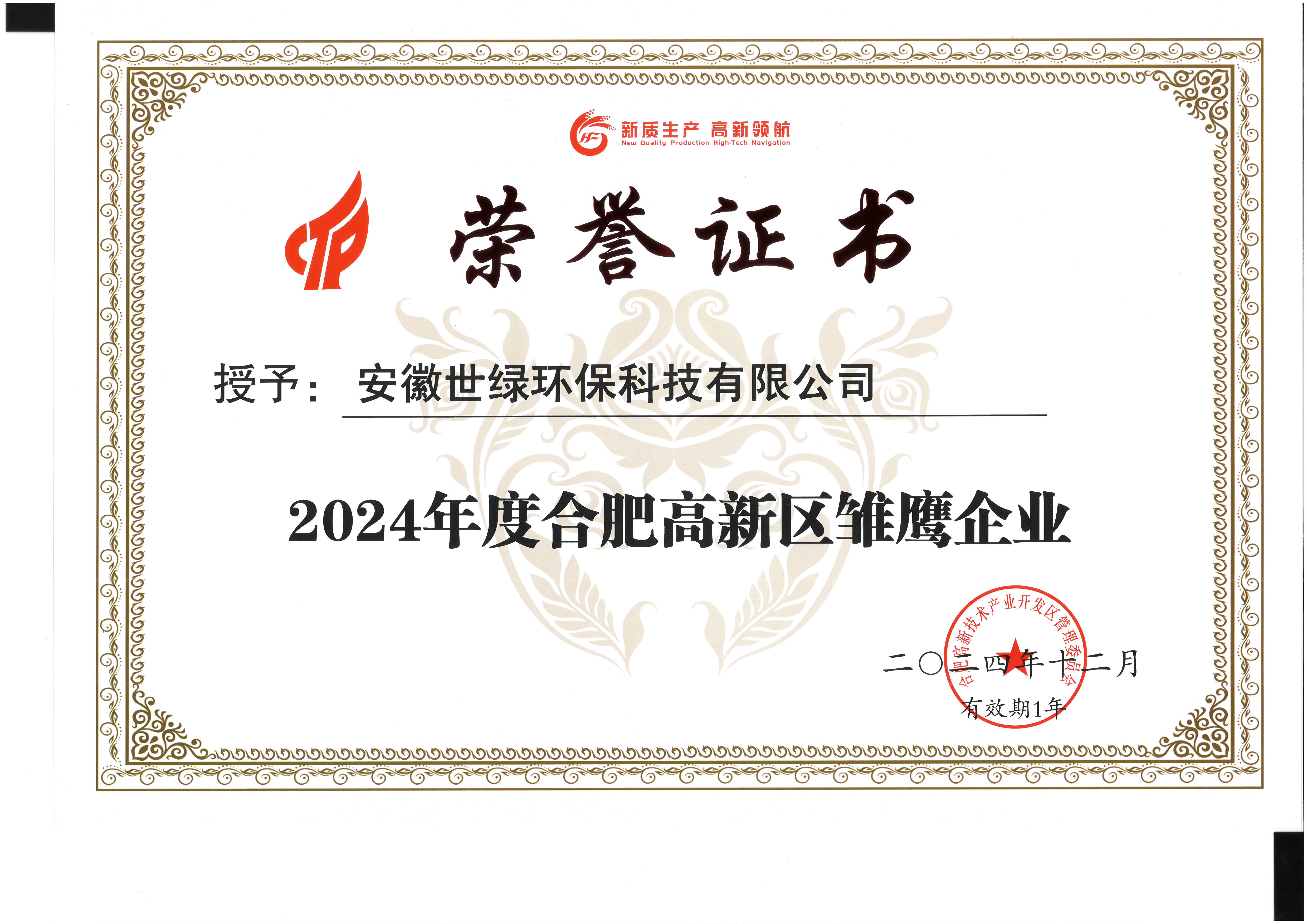 在2024年的尾聲,安徽世綠環??萍加邢薰緫{借其卓越的創新能力和在環保領域的杰出貢獻,榮獲了“2024年合肥高新區新質生產力企業”的稱號。這一榮譽不僅是對世綠環??萍奸L期以來努力的肯定,更是對其在推動環保產業發展、促進生態文明建設方面所做貢獻的高度認可。